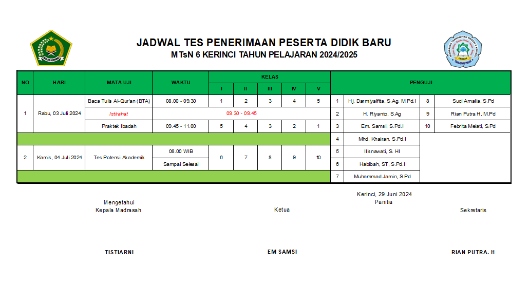 Panitia PPDB MTsN 6 Kerinci juga telah mengatur segala sesuatunya dengan baik, termasuk persiapan ruangan dan perlengkapan yang dibutuhkan untuk kelancaran pelaksanaan tes. Dengan persiapan yang matang, diharapkan semua calon peserta didik dapat mengikuti tes dengan lancar tanpa hambatan.