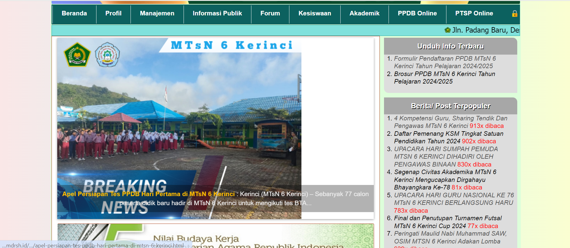 Kerinci (MTsN 6 Kerinci) – Setelah rangkaian tes Penerimaan Peserta Didik Baru (PPDB) yang telah dilaksanakan pada Rabu (03/07) dan Kamis (04/07), MTsN 6 Kerinci memasuki tahap selanjutnya. Em Samsi, S.Pd.I, selaku Ketua Panitia PPDB, mengungkapkan bahwa seluruh rangkaian kegiatan dari pendaftaran, seleksi berkas, hingga tes telah berlangsung sukses, lancar, dan aman.