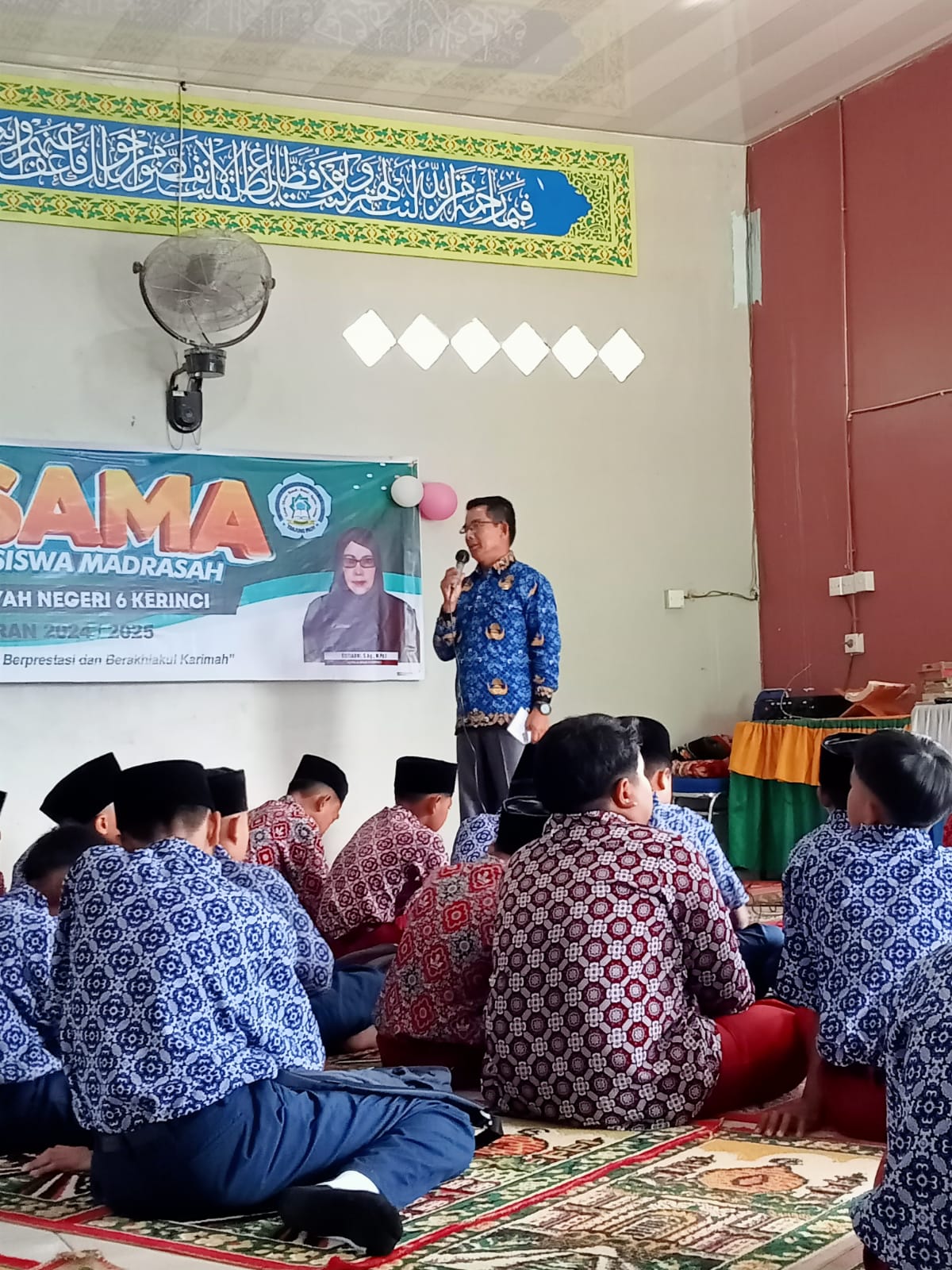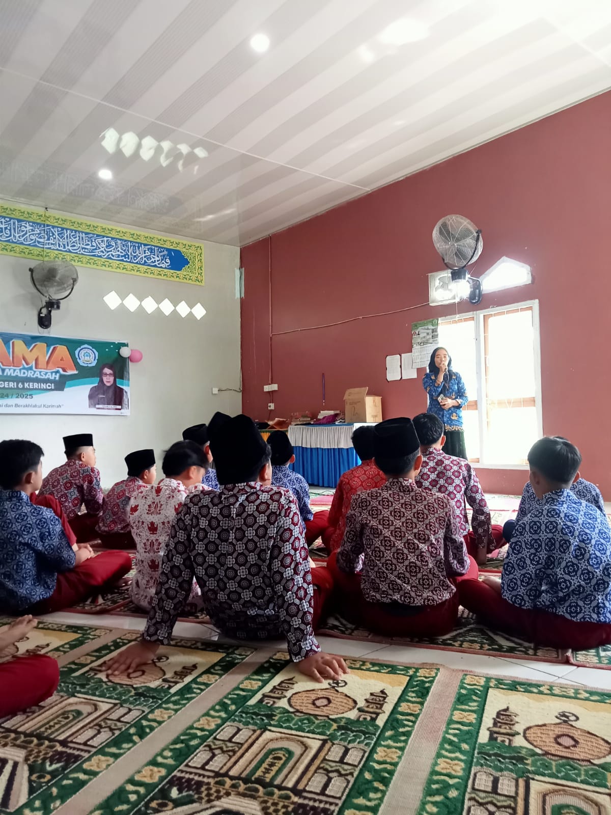 Kerinci (MTsN 6 Kerinci) – Pelaksanaan Masa Taaruf Siswa Madrasah (MATSAMA) jam siang pada hari kedua di MTsN 6 Kerinci kembali berlangsung dengan baik dan penuh semangat. Materi kedua yang dibahas pada hari ini adalah "Moderasi Beragama," yang disampaikan oleh Pembina Keagamaan MTsN 6 Kerinci sekaligus Ketua Panitia Pelaksana MATSAMA, Em. Samsi, S.Pd.I. Bertindak sebagai moderator untuk sesi ini adalah Lara Astrianda, S.Pd.