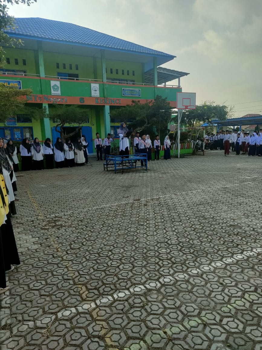 Kerinci (MTsN 6 Kerinci) – Apel upacara bendera hari Senin di MTsN 6 Kerinci berlangsung khidmat dan tertib. Pada upacara kali ini, petugas dari kelas XB melaksanakan tugasnya dengan baik, di bawah bimbingan Wakabid. Kurikulum, Hj. Darmiyalfita, S.Ag, M.Pd.I, yang bertindak sebagai pembina upacara.