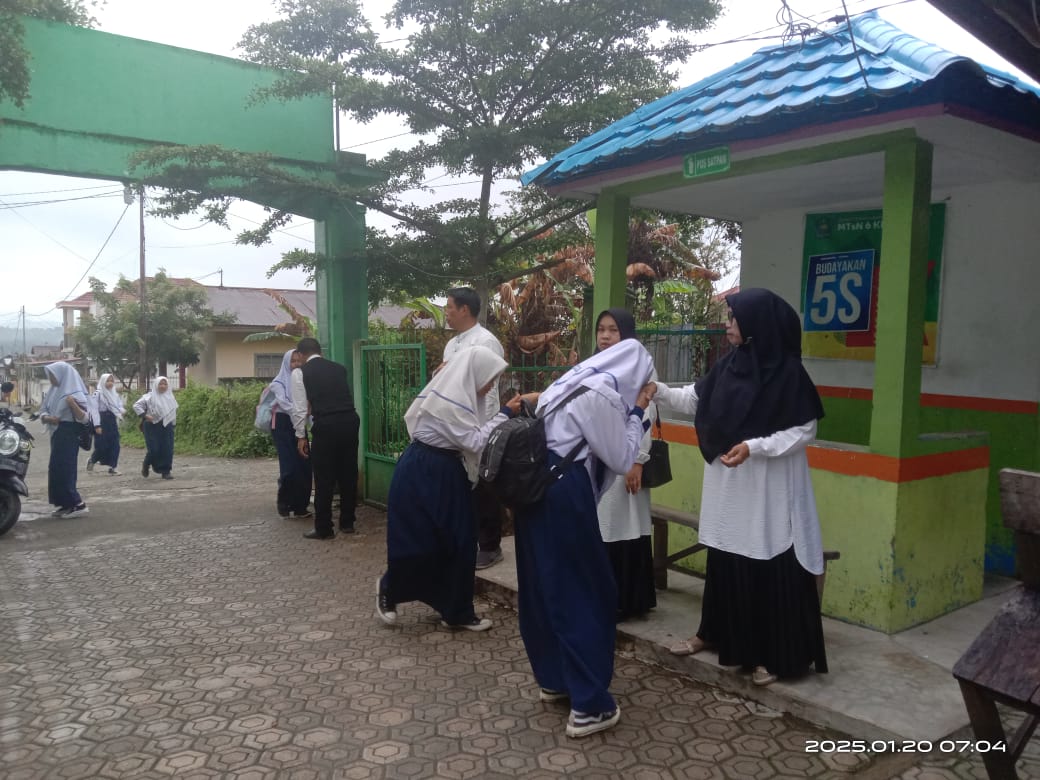 Kerinci (MTsN 6 Kerinci) – MTsN 6 Kerinci terus menggalakkan penerapan budaya 5S (Senyum, Salam, Sapa, Sopan, Santun) sebagai salah satu upaya menciptakan lingkungan sekolah yang nyaman, harmonis, dan damai. Budaya 5S ini tidak hanya menjadi kebiasaan sehari-hari, tetapi juga menjadi bagian dari pendidikan karakter yang diutamakan oleh madrasah.