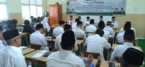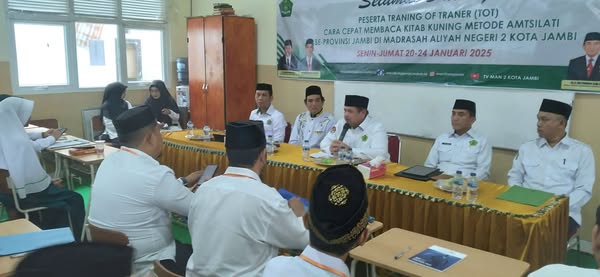Kerinci (MTsN 6 Kerinci) – Bidang Pendidikan Madrasah Kantor Wilayah Kementerian Agama Provinsi Jambi menyelenggarakan Training of Trainer (ToT) “Cara Cepat Membaca Kitab Kuning dengan Metode Amtsilati†pada Senin (20/1/2025). Acara ini berlangsung di Madrasah Aliyah Negeri (MAN) 2 Kota Jambi dan diikuti oleh berbagai madrasah se-Provinsi Jambi, termasuk MTsN 6 Kerinci yang berpartisipasi melalui platform Zoom.