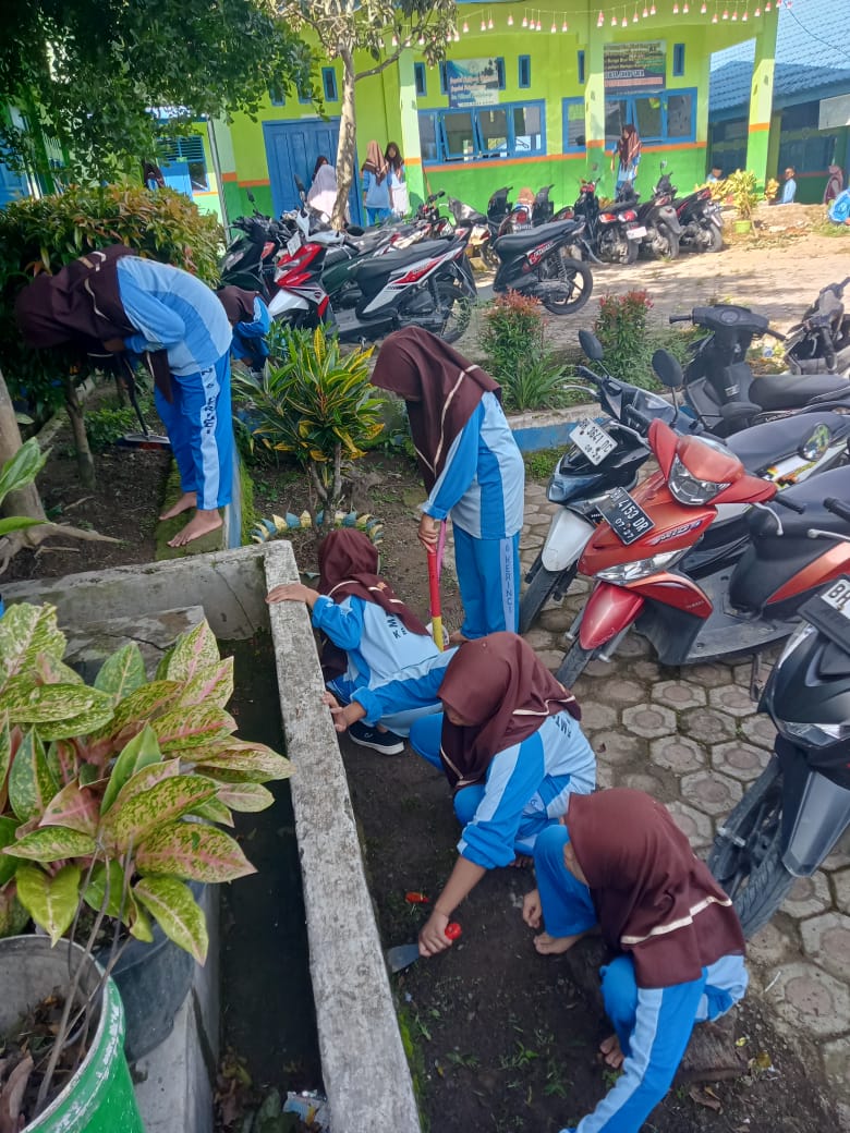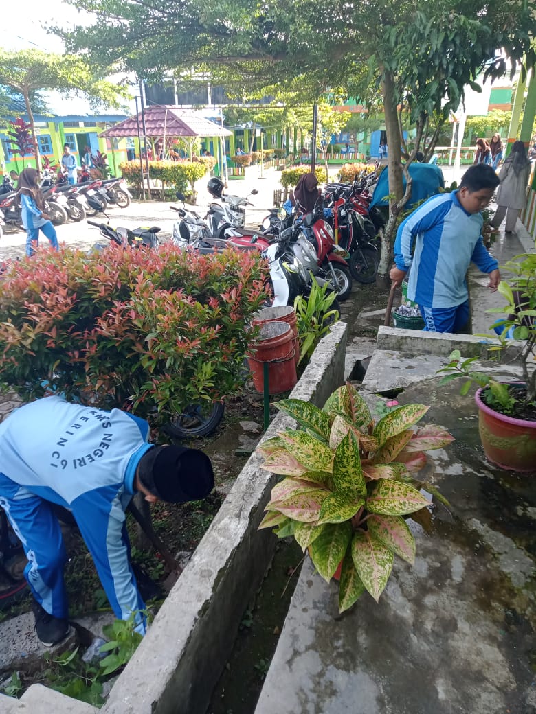 Kerinci (24/01/2025) - Guna mendukung program kerja Kememterian Agama Kabupaten Kerinci tentang kegiatan gotong royong (goro) melalui surat yang dikirimkan kepada seluruh Kepala Madrasah dengan Nomor Surat B.114/Kk.05.01/1.3/HM.03/01/2025 untuk itu MTs Negeri 6 Kerinci melaksanakan Kegiatan tersebut. Kegiatan goro ini di antaranya membersihkan lingkungan, meremajakan tanaman, menata taman Madrasah dengan berbagai jenis bunga dan tanaman toga. Kegiatan ini dirutinkan dengan melibatkan pihak Madrasah dan siswa .