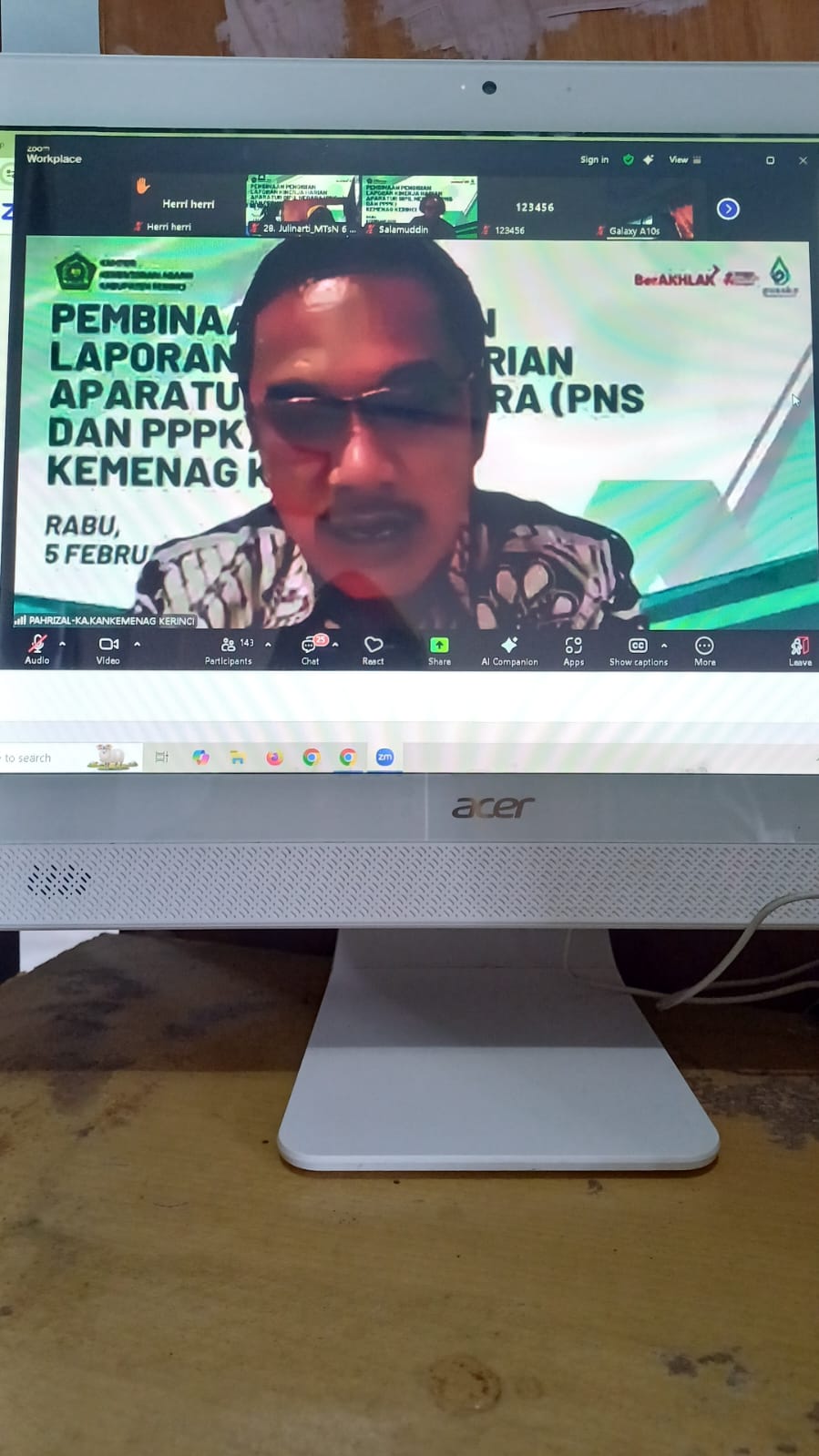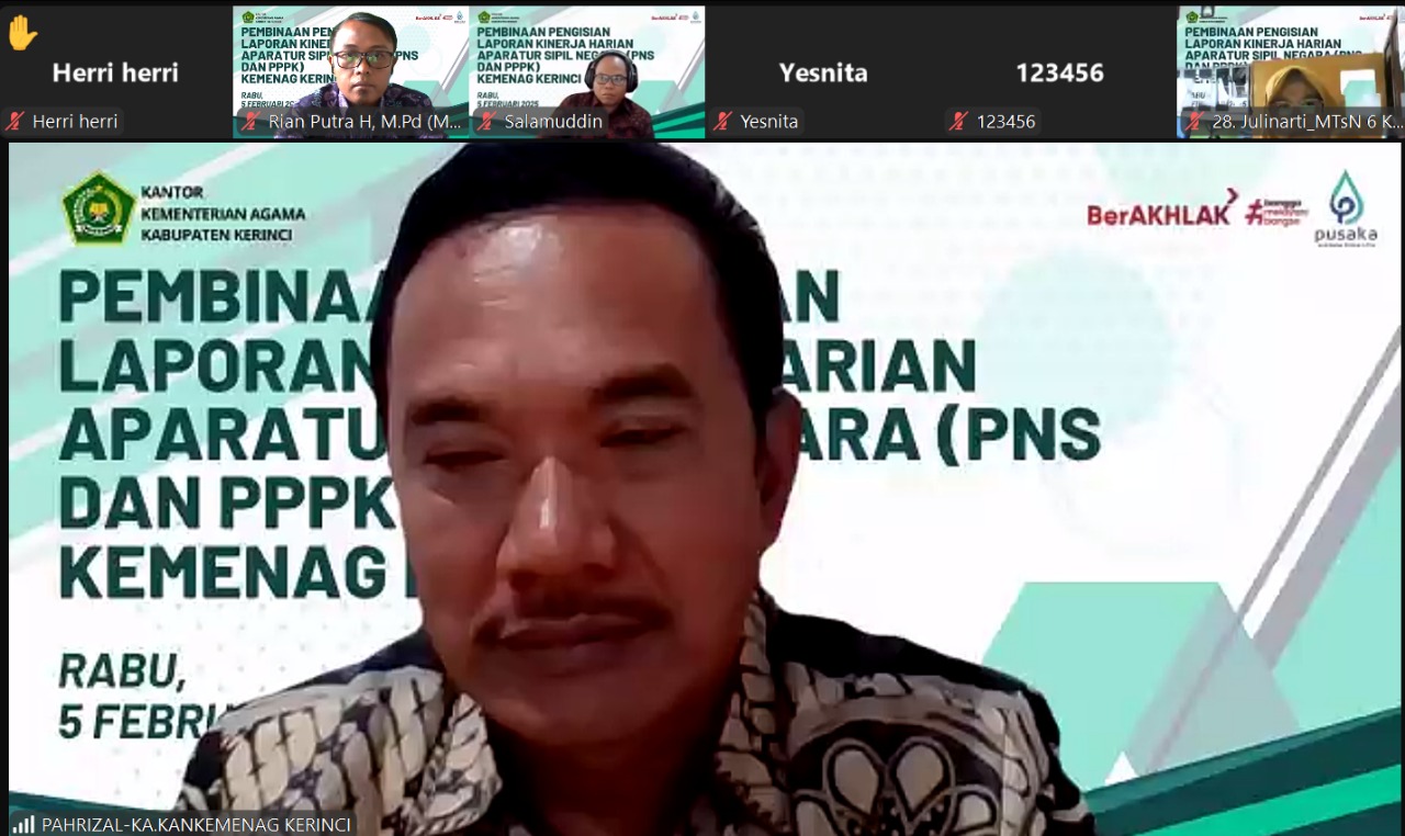 Kerinci (MTsN 6 Kerinci) – Kantor Kementerian Agama (Kemenag) Kabupaten Kerinci menyelenggarakan kegiatan pembinaan pengisian Laporan Kinerja Harian Pegawai (LKHP) bagi Aparatur Sipil Negara (ASN) dan Pegawai Pemerintah dengan Perjanjian Kerja (PPPK). Kegiatan ini dilaksanakan secara virtual melalui platform Zoom pada pukul 09.00 WIB dan dibuka secara resmi oleh Kepala Kantor Kemenag Kabupaten Kerinci, H. Pahrizal, S.Ag, MM.