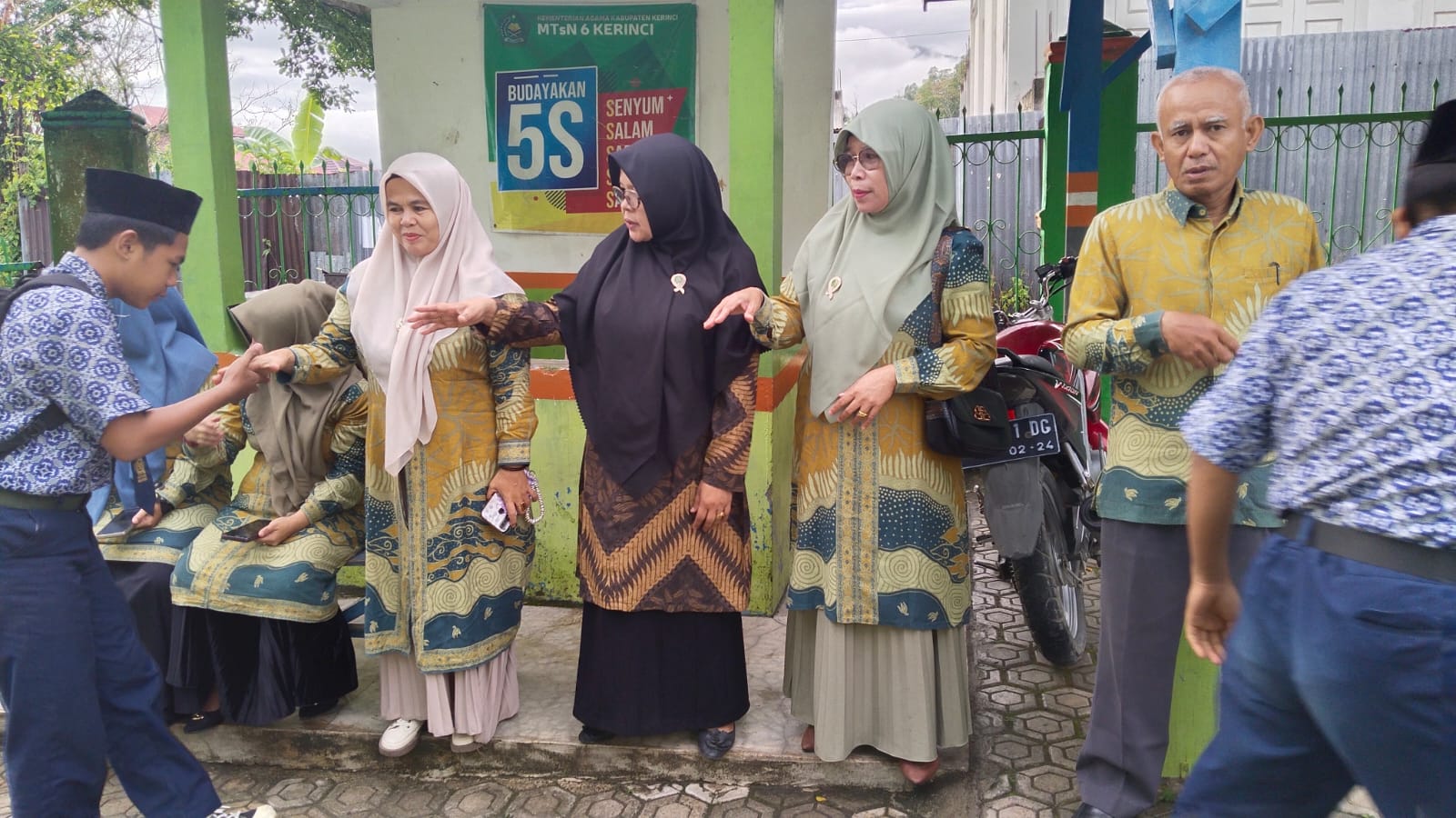 Kerinci (MTsN 6 Kerinci) – Setiap pagi, guru piket MTsN 6 Kerinci menyambut kedatangan siswa di pintu gerbang madrasah. Langkah ini merupakan bagian dari penerapan budaya 5S (Senyum, Salam, Sapa, Sopan, dan Santun) yang telah menjadi komitmen madrasah dalam membentuk karakter positif siswa.