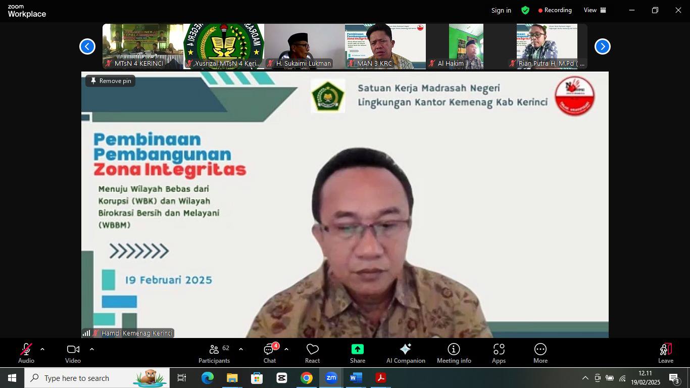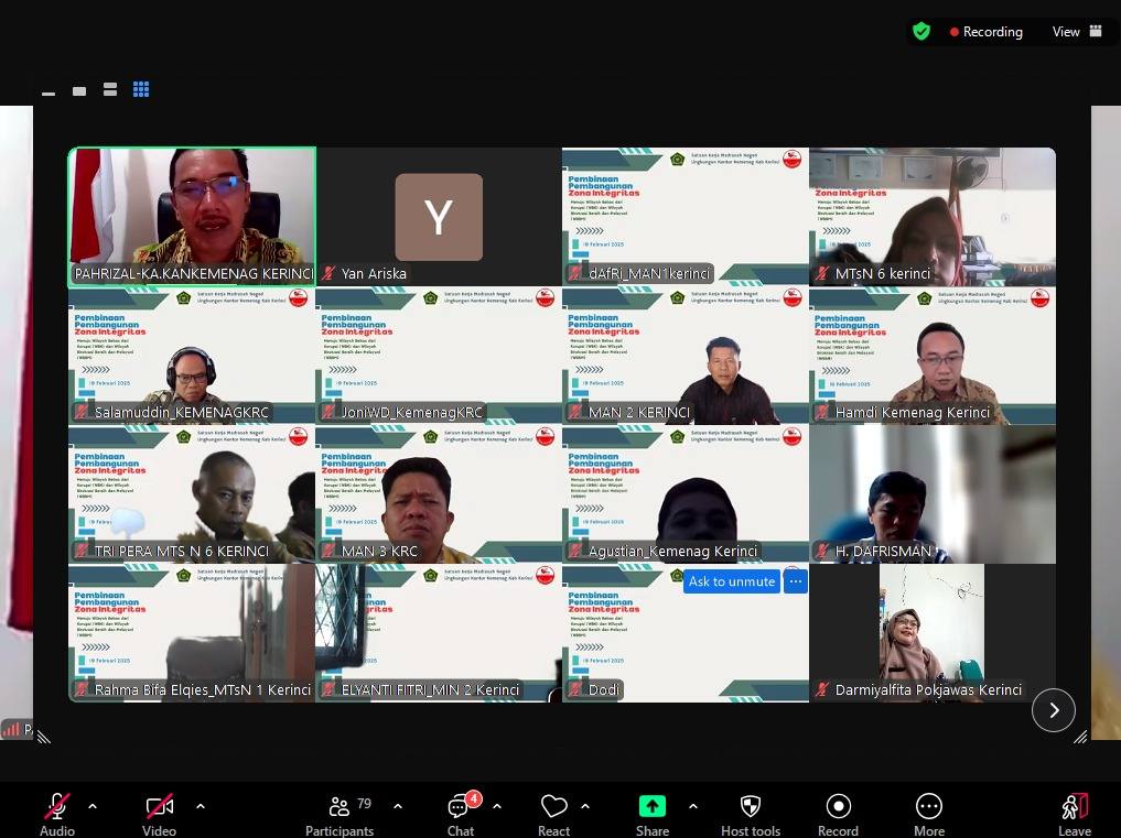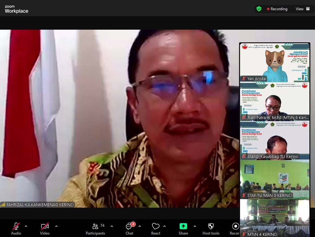 Kerinci (MTsN 6 Kerinci) – Kantor Kementerian Agama (Kemenag) Kabupaten Kerinci menyelenggarakan kegiatan pembinaan dan evaluasi pembangunan Zona Integritas (ZI) bagi satuan kerja Madrasah Negeri di bawah lingkup Kemenag Kerinci. Acara ini berlangsung secara daring melalui Zoom dan diikuti oleh para Kepala Madrasah Negeri, Pengawas, Kepala Urusan Tata Usaha (Kaur TU), serta staf tata usaha madrasah.