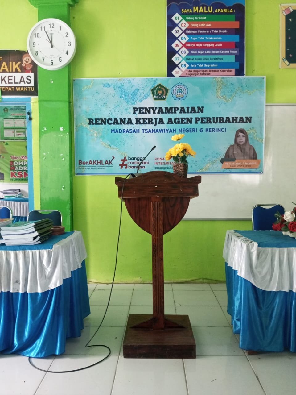 Kerinci (MTsN 6 Kerinci) – Persiapan acara penyampaian program kerja calon Agen Perubahan dan pemilihan final Agen Perubahan MTsN 6 Kerinci tahun 2025 telah mencapai hampir 100%. Acara yang rencananya digelar besok, Senin (10/3), bertempat di ruang guru MTsN 6 Kerinci, diharapkan dapat berjalan lancar dan sukses. Kegiatan ini merupakan puncak dari proses seleksi yang telah dilakukan sejak Februari lalu.