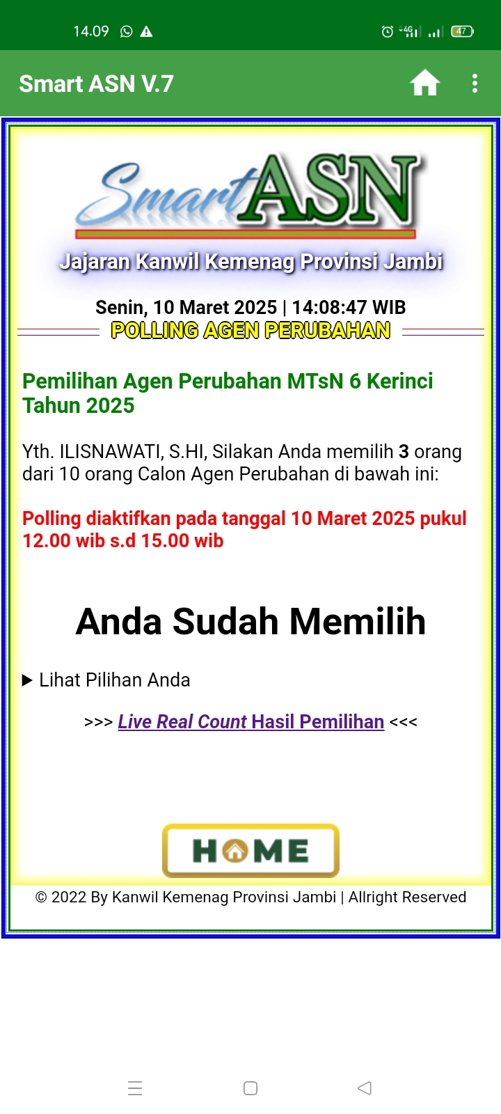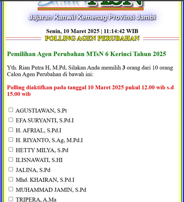 Kerinci, (MTsN 6 Kerinci) – Hari ini Senin tanggal 10 Maret 2025 Madrasah Tsanawiyah Negeri 6 Kerinci resmi melaksanakan pemilihan Agen Perubahan sebagai bagian dari upaya peningkatan kualitas layanan dan budaya kerja di lingkungan madrasah. Proses pemilihan ini dilakukan secara digital melalui platform SMART ASN, yang memungkinkan transparansi dan partisipasi aktif seluruh warga madrasah.