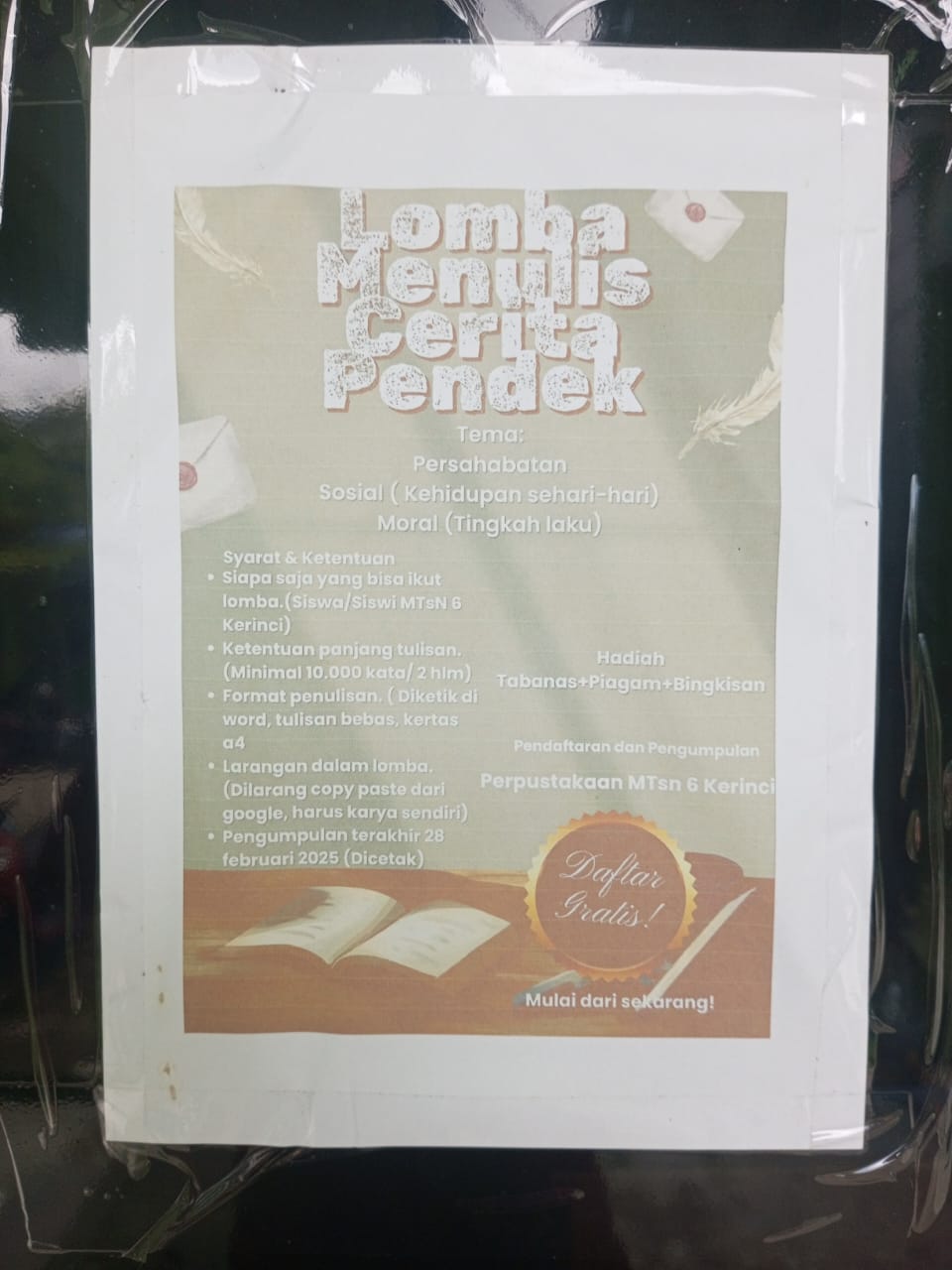 Kerinci (MTsN 6 Kerinci) – Suasana penuh kebanggaan menyelimuti Musholla MTsN 6 Kerinci pada Rabu (16/04/2025) pagi, usai kegiatan tadarus dilaksanakan. Perpustakaan MTsN 6 Kerinci resmi menutup rangkaian Lomba Cipta Puisi dan Cerpen dengan acara penyerahan hadiah kepada para pemenang. Kegiatan ini merupakan bagian dari program literasi madrasah untuk menggali kreativitas siswa dalam dunia kepenulisan.