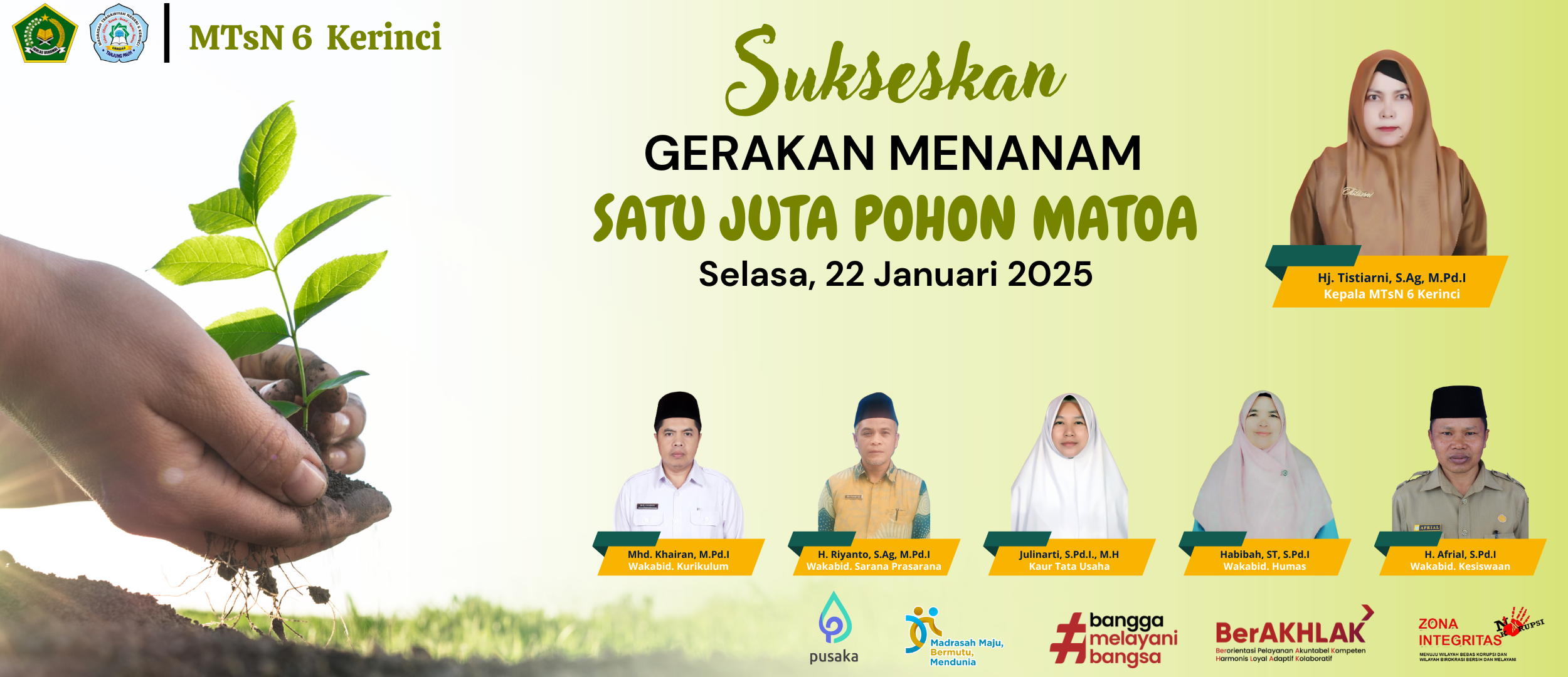 Kerinci (MTsN 6 Kerinci) – Dalam rangka memperingati Hari Bumi yang jatuh pada 22 April, MTsN 6 Kerinci menyatakan kesiapan penuh untuk mendukung dan menyukseskan program Gerakan Menanam Satu Juta Pohon Matoa. Kegiatan ini akan dilaksanakan pada Selasa, 22 April 2025, dan dipusatkan di lingkungan madrasah.