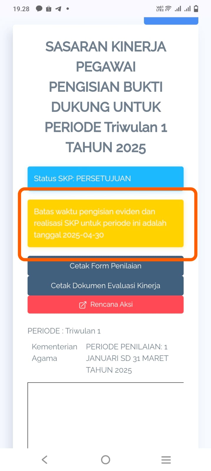 Kerinci (MTsN 6 Kerinci) – Wakil Kepala Bidang Kurikulum MTsN 6 Kerinci, Mhd. Khairan, M.Pd.I, menyampaikan pengingat penting kepada seluruh Aparatur Sipil Negara (ASN) di lingkungan madrasah untuk segera melengkapi bukti dukung Sasaran Kinerja Pegawai (SKP) Triwulan I Tahun 2025. Pengumpulan dokumen bukti dukung ini paling lambat tanggal 30 April 2025 dan menjadi bagian dari proses evaluasi kinerja ASN yang wajib dilakukan setiap triwulan.