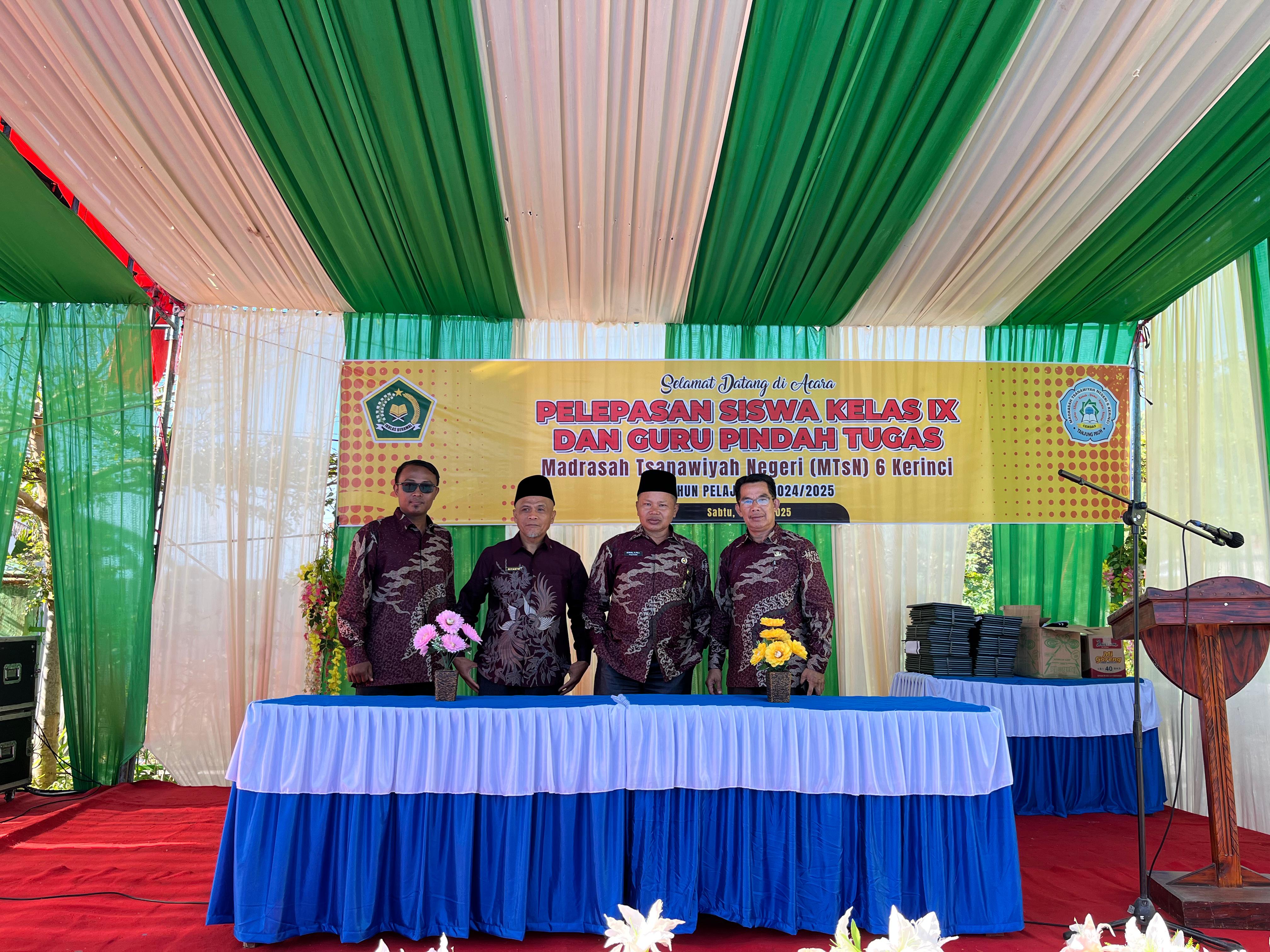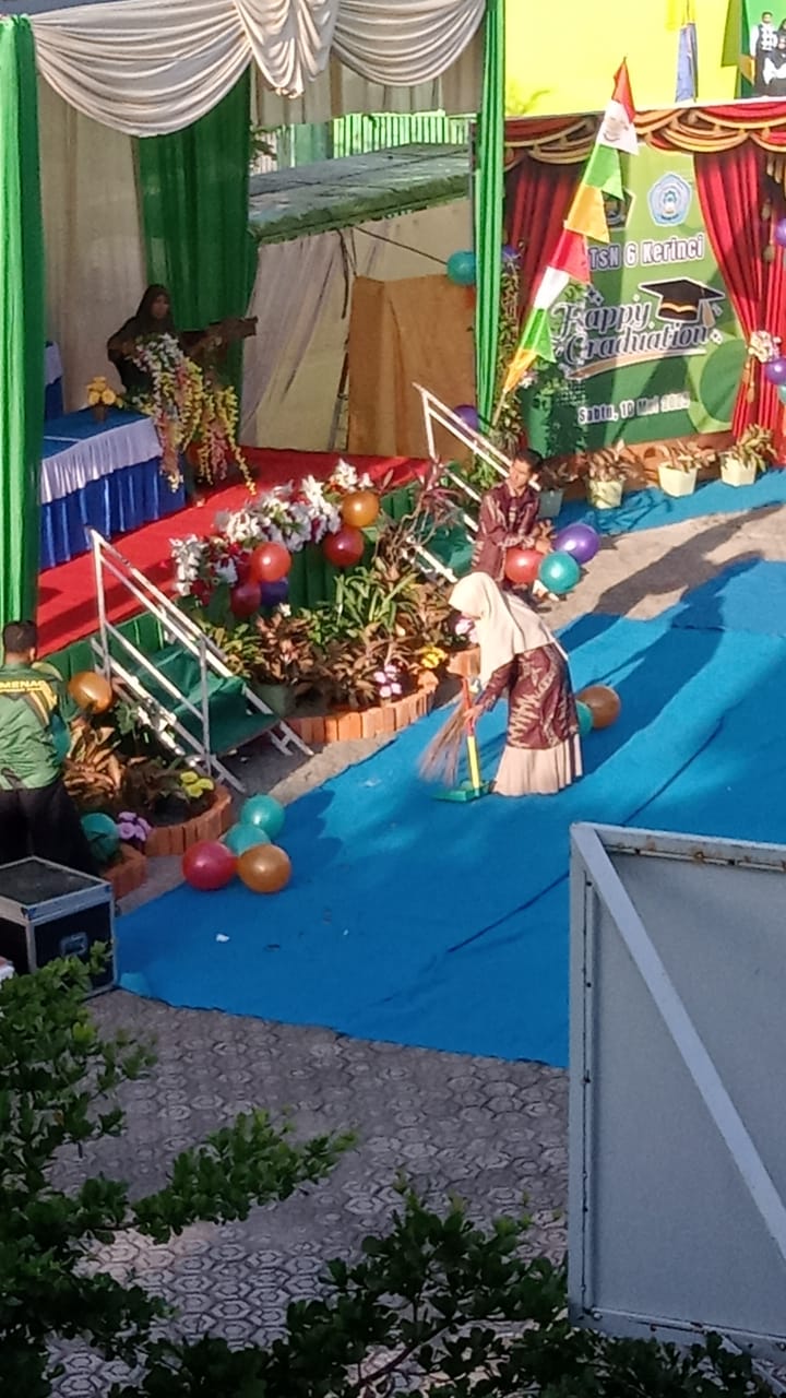 Kerinci (MTsN 6 Kerinci) – Suasana penuh semangat gotong royong menyelimuti lapangan MTsN 6 Kerinci pada hari Sabtu, 10 Mei 2025, saat detik-detik akan dimulainya acara perpisahan dan pelepasan peserta didik kelas IX Tahun Pelajaran 2024/2025, yang sekaligus dirangkaikan dengan acara pelepasan guru yang pindah tugas. Tidak hanya siswa, para guru dan orang tua murid juga tampak hadir dan memberikan dukungan penuh pada kegiatan tersebut.