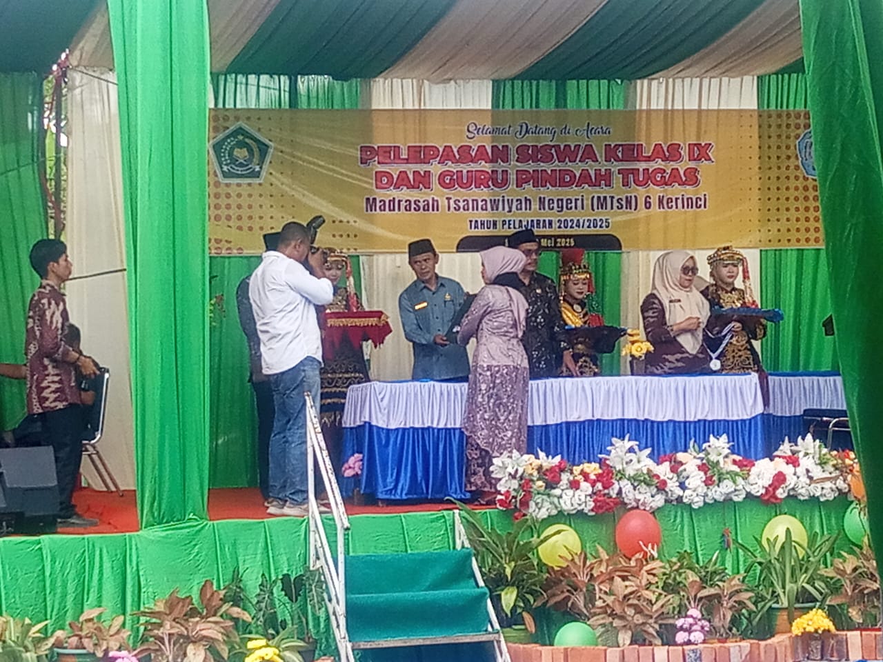 Kepala MTsN 6 Kerinci dalam sambutannya menyampaikan pesan motivasi kepada para lulusan agar terus menimba ilmu dan menjaga akhlak mulia di jenjang pendidikan berikutnya. Sementara itu, Kepala Kantor Kementerian Agama Kabupaten Kerinci, H. Pahrizal, S.Ag., MM., turut hadir memberikan arahan dan apresiasi terhadap capaian madrasah dalam membina siswa tidak hanya secara akademik, tetapi juga dalam hal karakter dan spiritualitas.