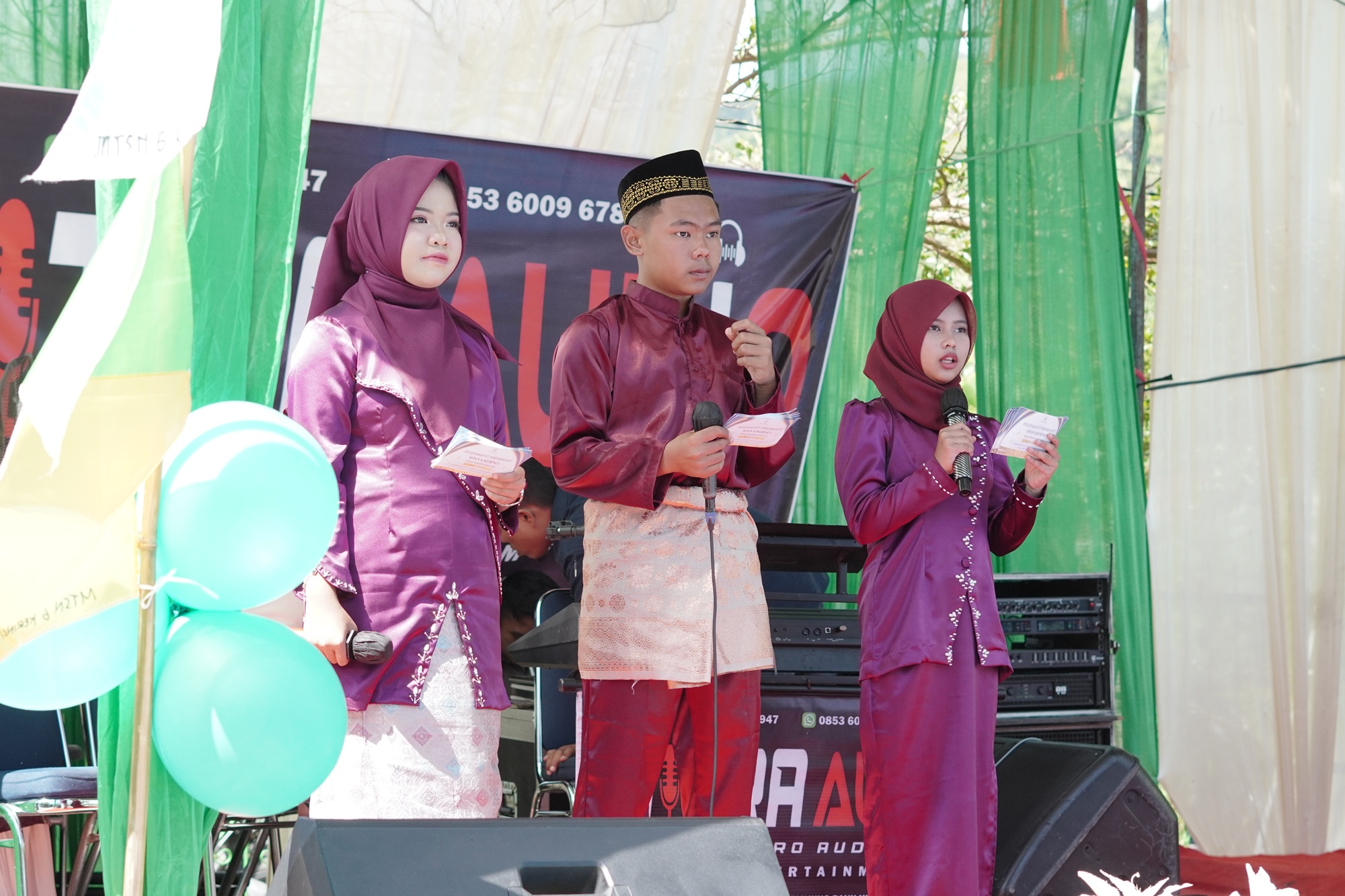 Tugas sebagai MC tiga bahasa dipercayakan kepada tiga siswa terbaik MTsN 6 Kerinci, yaitu Zahira Rajwa Putri, Syifa, dan Syafik Akbar. Ketiganya sukses membawakan seluruh rangkaian acara dengan lancar, rapi, dan penuh percaya diri. Kehadiran MC dengan kemampuan multilingual ini menjadi daya tarik tersendiri dalam acara yang digelar di lapangan madrasah pada Sabtu, 10 Mei 2025.