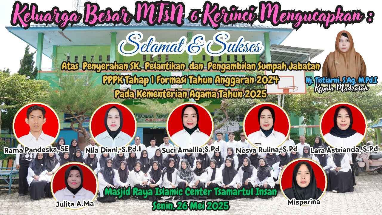 Kerinci (MTsN 6 Kerinci), Hari ini Senin 26 Mei 2025 segenap warga MTsN 6 Kerinci mengucapkan selamat dan apresiasi kepada para Pegawai Pemerintah dengan Perjanjian Kerja (PPPK) MTsN 6 Kerinci yang telah resmi dilantik dan diambil sumpah jabatannya.