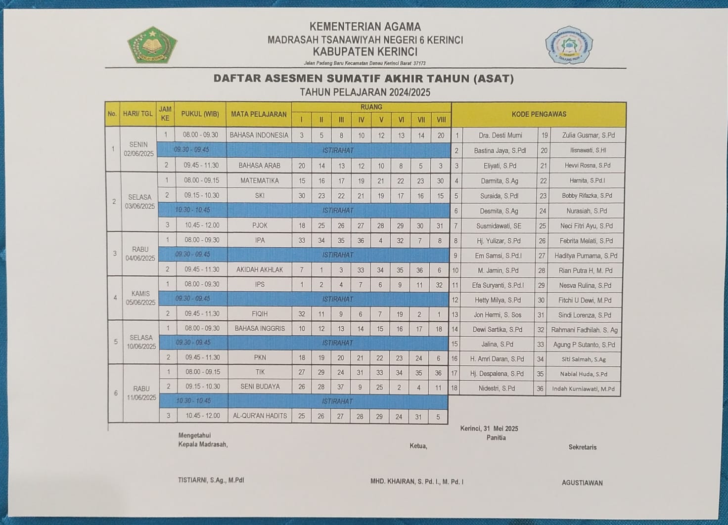Keputusan ini diambil oleh panitia pelaksana ASAT MTsN 6 Kerinci yang diketuai oleh Mhd. Khairan, M.Pd.I, dan telah dikomunikasikan kepada seluruh warga madrasah, termasuk guru, wali kelas, dan peserta didik.