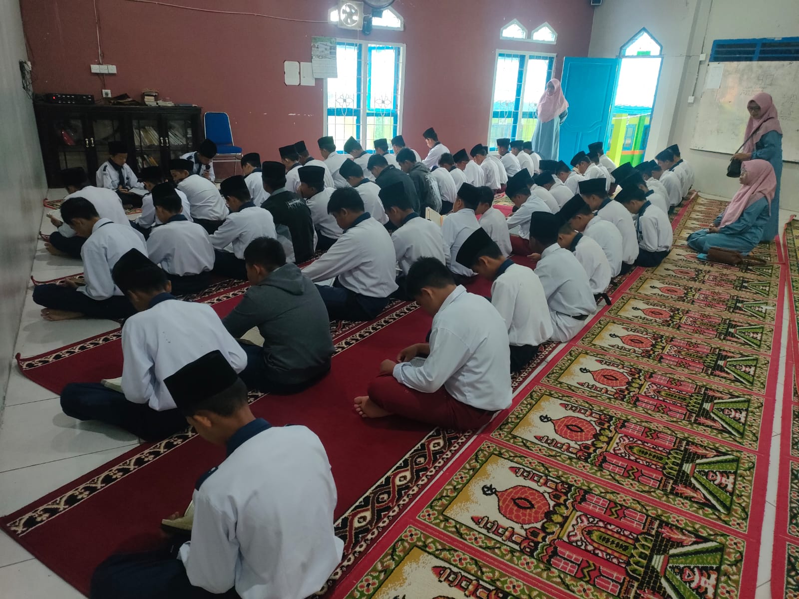 Kerinci (MTsN 6 Kerinci) – Kegiatan tadarus pagi di MTsN 6 Kerinci yang biasanya dilaksanakan di lapangan madrasah, pada hari ini mengalami perubahan lokasi. Karena cuaca gerimis sejak pagi, pihak madrasah memutuskan untuk memindahkan kegiatan ke musholla MTsN 6 Kerinci demi kenyamanan dan kelancaran acara.