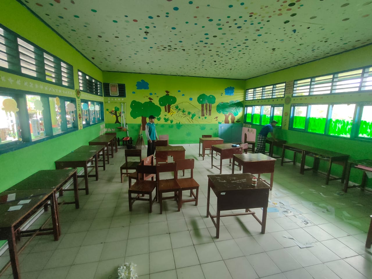 Selain membersihkan ruangan, tim teknis juga melakukan pengecekan kesiapan perangkat komputer dan server cadangan, termasuk pengaturan tempat duduk peserta agar sesuai dengan protokol ANBK.