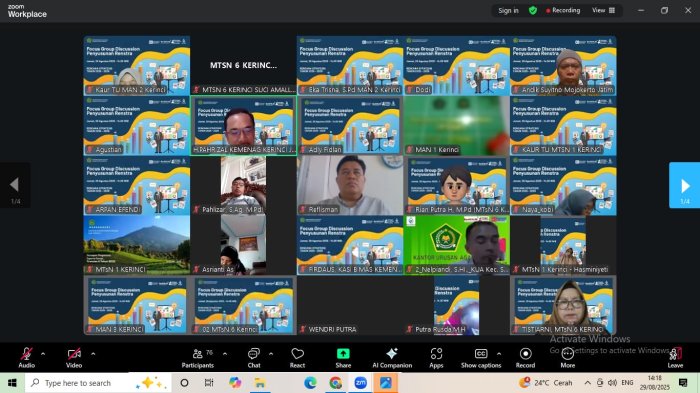 Kegiatan ini diikuti oleh seluruh kepala madrasah di lingkungan Kementerian Agama Kabupaten Kerinci. Zoom RAB Renstra tersebut membahas perencanaan program kerja madrasah yang efektif, efisien, serta sesuai dengan arah kebijakan pendidikan madrasah.