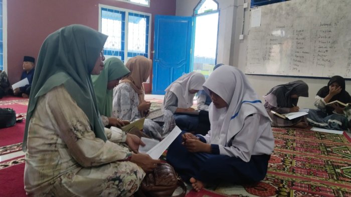 Suasana hujan deras justru menambah kekhusyukan para siswa dalam menghafal ayat-ayat suci Al-Qur’an. Dengan bimbingan ustaz dan ustazah pembina, para peserta fokus menyetorkan hafalan satu per satu.