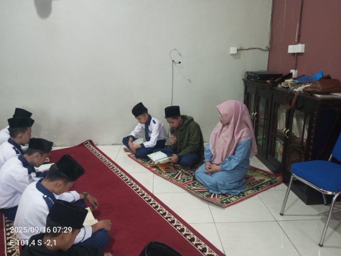 Kerinci (16/09/2025)… Kegiatan tadarus Al-Qur’an rutin yang biasanya dilaksanakan di lapangan madrasah hari ini dialihkan ke mushalla. Hal ini dikarenakan hujan turun cukup deras sejak pagi sehingga seluruh siswa diarahkan untuk melaksanakan tadarus di dalam ruangan.