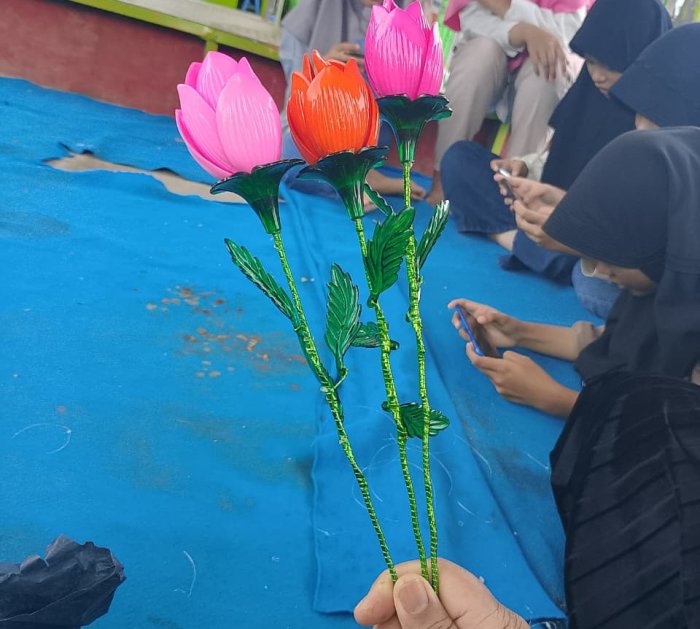 Setiap siswa diberi kesempatan berkreasi sesuai imajinasi masing-masing. Dari potongan-potongan plastik yang biasa dianggap limbah, terciptalah rangkaian bunga tulip berwarna-warni yang tampak cantik dan mempesona.