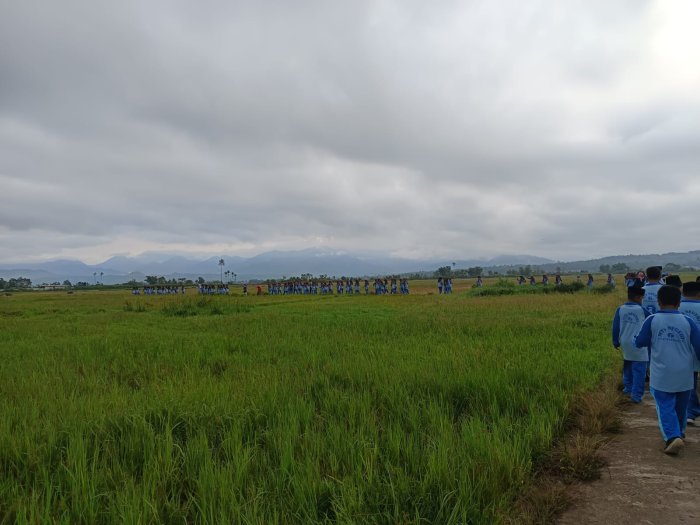 Rute jalan santai kali ini mengambil jalur baru menuju area sawah di sekitar madrasah, sehingga peserta dapat menikmati suasana alam yang asri dan hamparan sawah yang menyejukkan. Pemandangan ini memberikan semangat dan motivasi tersendiri bagi siswa untuk tetap aktif bergerak dan menjaga kesehatan.