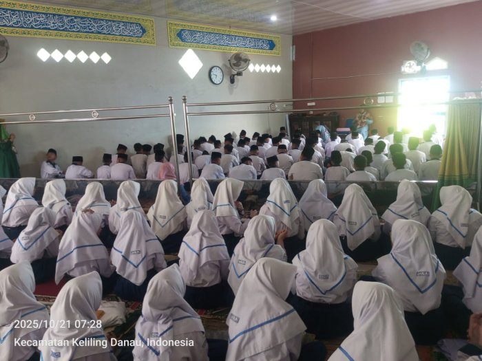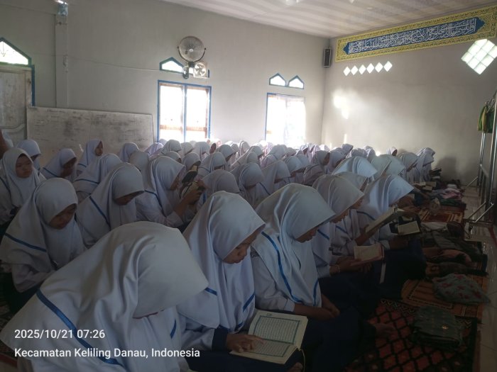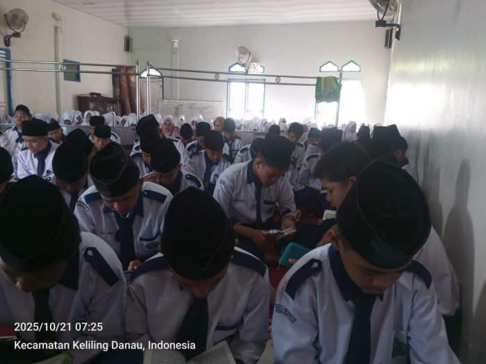 Kerinci (21/10/2025)….. Suasana pagi di MTsN 6 Kerinci terasa lebih khusyuk dari biasanya. Hujan yang turun sejak waktu subuh membasahi lapangan madrasah, membuat kegiatan tadarus pagi yang biasanya dilaksanakan di lapangan harus dipindahkan ke dalam mushalla. Meskipun demikian, semangat para siswa untuk membaca ayat-ayat suci Al-Qur’an tidak berkurang sedikit pun.