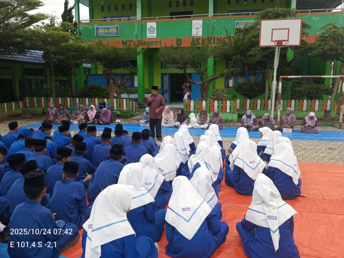 Kerinci (24/10/2025)�. Dalam suasana pagi yang cerah di MTsN 6 Kerinci, kegiatan pembinaan rutin siswa kembali diisi dengan materi inspiratif dari Wakil Kepala Madrasah Bidang Kurikulum, Bapak Moh. Khairan, M.Pd.I. Dengan gaya penyampaian yang tenang namun penuh makna, beliau mengingatkan seluruh siswa tentang pentingnya menanamkan �Tujuh Kebiasaan Hebat Anak Indonesia� sebagai bekal menjadi generasi unggul dan berkarakter.
