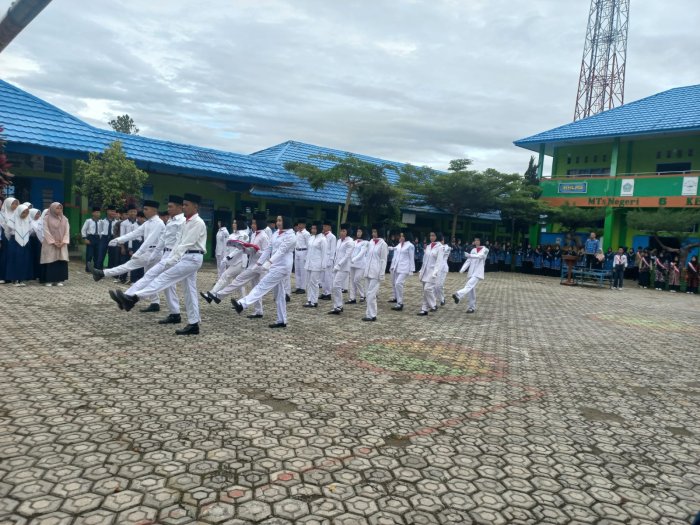 Kerinci (MTsN 6 Kerinci) Suasana khidmat dan penuh semangat patriotisme menyelimuti lapangan madrasah saat Pasukan Pengibar Bendera (Paskibra) MTsN 6 Kerinci tampil memukau dalam upacara peringatan Hari Pahlawan, Senin 10 November 2025. Dengan langkah tegap dan kompak, pasukan pengibar bendera sukses mengibarkan Sang Merah Putih dengan sempurna di hadapan seluruh peserta upacara.