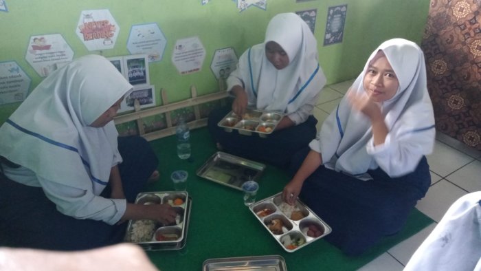 Pojok baca yang awalnya dirancang untuk meningkatkan minat literasi siswa, kini menjadi ruang multifungsi yang tidak hanya digunakan untuk menambah ilmu pengetahuan melalui buku-buku yang tersedia, tetapi juga menjadi tempat makan bersama para siswi VIII B selama kegiatan MBG berlangsung. Dengan suasana yang nyaman dan penuh keakraban, siswi terlihat duduk rapi sambil berbagi bekal dan cerita ringan setelah membaca, sehingga area tersebut menjadi semakin hidup dan bermakna.