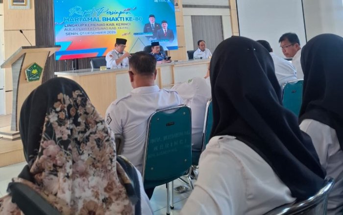Kerinci (MTsN 6 Kerinci) Hari ini Senin 01 Desember 2025 Kepala MTsN 6 Kerinci Ibu Tistiarni, S.Ag,M.Pd.I menghadiri rapat persiapan Hari Amal Bhakti (HAB) Kementerian Agama Kabupaten Kerinci Tahun 2026 yang berlangsung di Aula Kantor PLHUT Kemenag Kerinci. Rapat ini mempertemukan para pimpinan madrasah dan satuan kerja untuk membahas berbagai agenda yang akan menjadi rangkaian kegiatan HAB tahun mendatang.