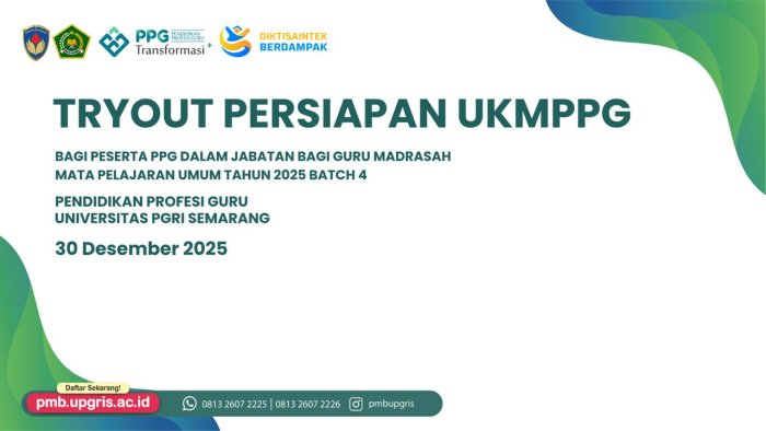 Kegiatan tryout ini khusus diperuntukkan bagi guru madrasah mata pelajaran umum yang sedang menjalani program PPG dalam Jabatan Batch 4 Tahun 2025. Tryout dilaksanakan secara daring untuk memberikan simulasi soal-soal UKMPPG sekaligus evaluasi awal terhadap kemampuan peserta sebelum menghadapi ujian resmi. Selain mengasah keterampilan mengerjakan soal, kegiatan ini juga menjadi ajang sharing pengetahuan dan strategi di antara para peserta.