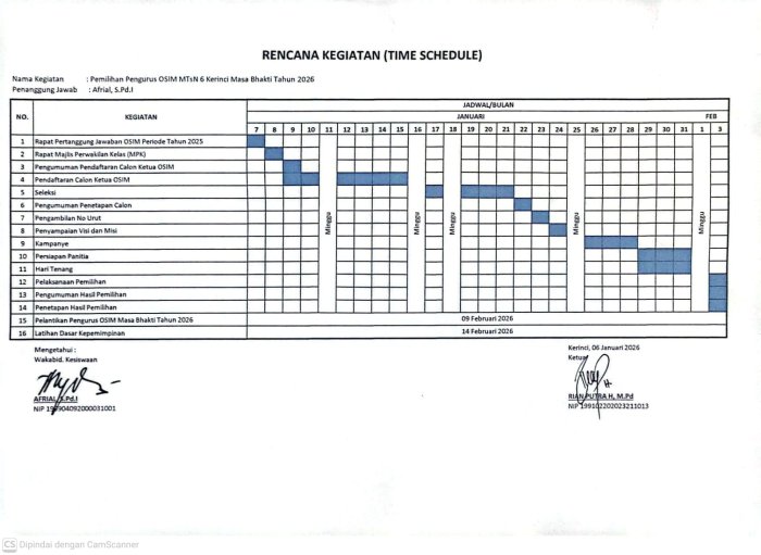 Dokumen time schedule ini disusun oleh Ketua Pelaksana sekaligus Pembina OSIM MTsN 6 Kerinci, Rian Putra H, M.Pd., dan diketahui oleh Wakil Kepala Bidang Kesiswaan sekaligus Pelaksana Tugas Kepala Madrasah, H. Afrial, S.Pd.I. Rangkaian kegiatan dirancang untuk memastikan proses pemilihan berjalan tertib, melibatkan partisipasi luas, dan menghasilkan pemimpin siswa yang berkualitas.