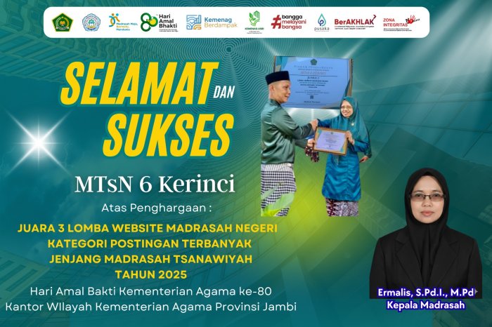 Kerinci (MTsN 6 Kerinci) MTsN 6 Kerinci kembali menorehkan prestasi membanggakan dengan meraih penghargaan bergengsi Terbaik 3 Website kategori Postingan Terbanyak di tingkat Kantor Wilayah Kementerian Agama Provinsi Jambi. Penghargaan tersebut diserahkan langsung oleh Kepala Kantor Wilayah Kementerian Agama Provinsi Jambi pada acara puncak peringatan Hari Amal Bakti (HAB) ke-80 Kementerian Agama Republik Indonesia Tahun 2026.