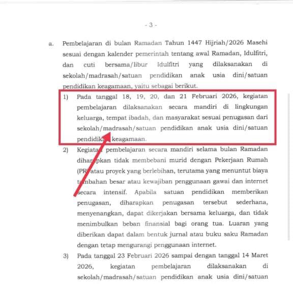 Surat edaran bersama tersebut mengatur penyesuaian hari libur dan kegiatan pembelajaran pada satuan pendidikan menjelang pelaksanaan ibadah puasa. Kebijakan ini bertujuan memberikan kesempatan kepada peserta didik, pendidik, dan tenaga kependidikan untuk mempersiapkan diri secara fisik dan spiritual dalam menyambut bulan Ramadhan.