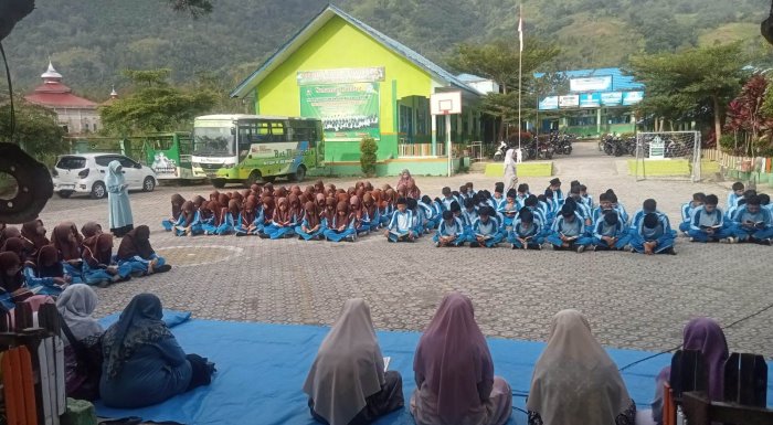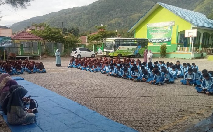 Dengan mengenakan seragam olahraga identitas Madrasah, para siswa duduk rapi beralaskan terpal biru dan paving block. Kelompok siswa putra dan putri nampak khidmat melantunkan ayat-ayat suci, didampingi oleh para guru yang turut menyimak dengan saksama.