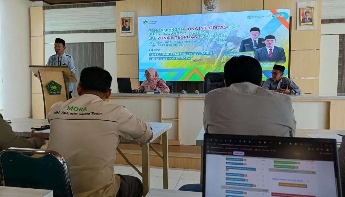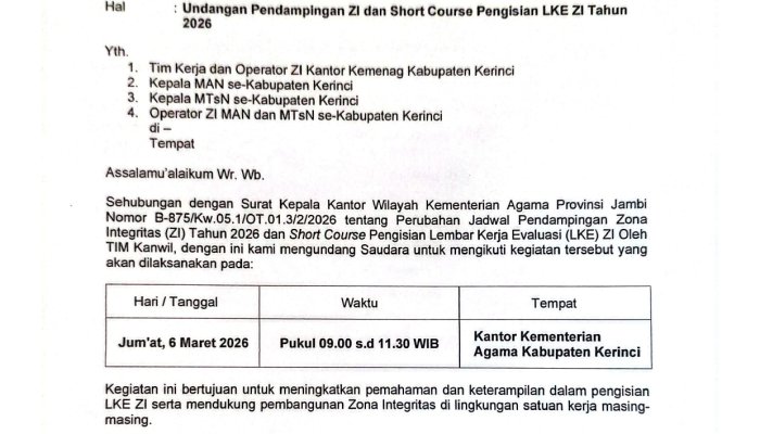 MTsN 6 Kerinci (07/03/2026) - Pada hari jum'at (06/03/2026) Bertempat di Aula Kantor Kementerian Agama Kabupaten Kerinci, puluhan operator Penilaian Mandiri Pembangunan Zona Integritas (PMP ZI) menghadiri undangan kegiatan Pendampingan Zona Integritas dan Short Course Pengisian Lembar Kerja Evaluasi (LKE) ZI Tahun 2026.