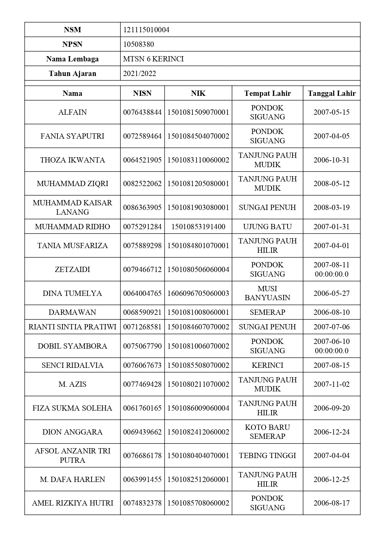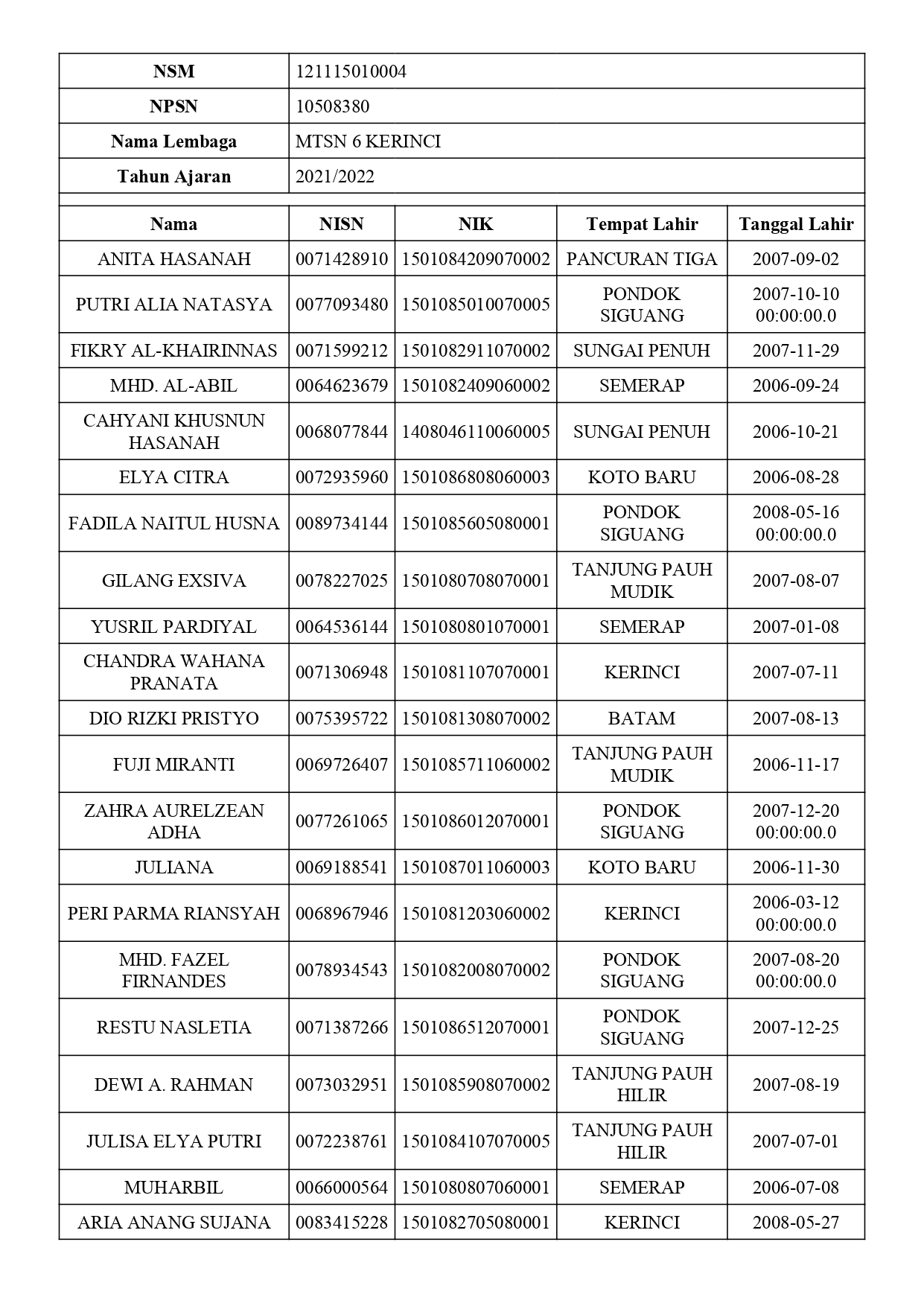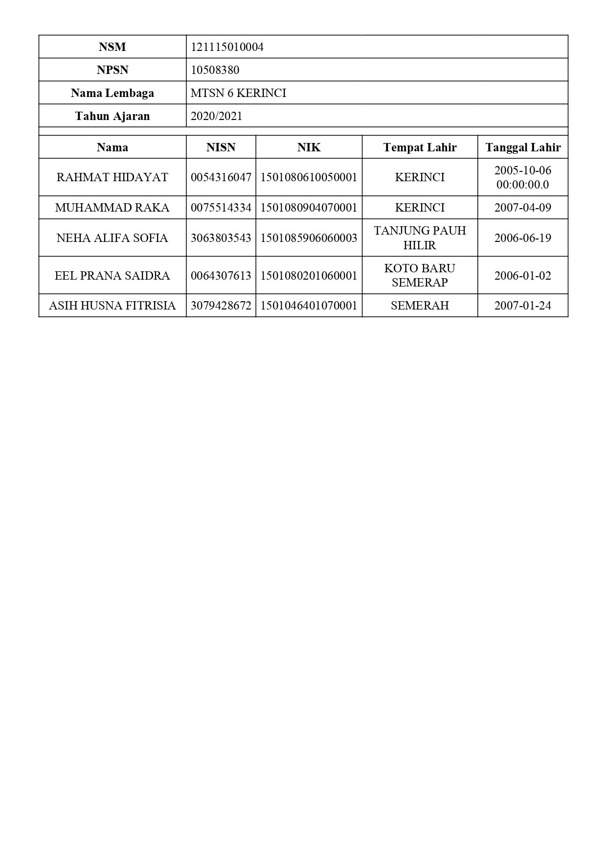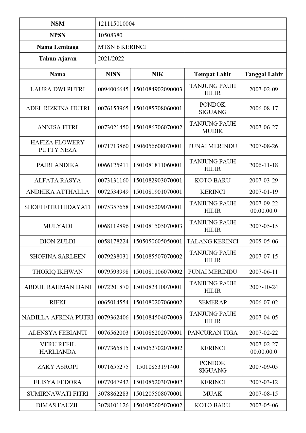 Selamat Datang di Website Resmi MTSN 6 Kerinci # Jln. Padang Baru, Desa Permai Baru, Tanjung Pauh Hilir, Kecamatan Danau Kerinci Barat, Kabupaten Kerinci, Provinsi Jambi # MTsN 6 Kerinci Menerima Peserta Didik Baru Tapel 2025/2026 # Madrasah Hebat Bermartabat # Selamat Datang di Website Resmi MTsN 6 Kerinci